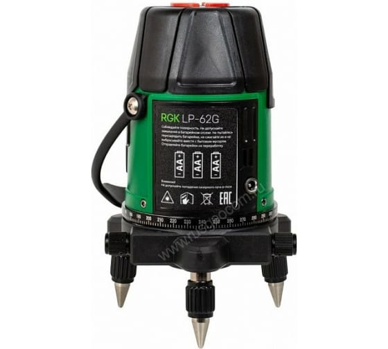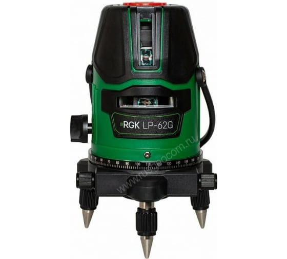 - Трегер устройства с регулируемыми по высоте металлическими ножками дает возможность выставить горизонт. Помимо этого, лазерный нивелир RGK LP-62G можно установить на штатив с резьбой 5/8".
